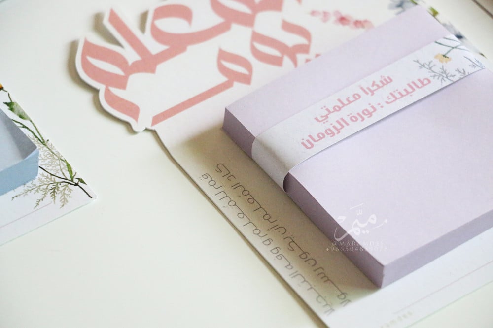 تلف على النوته ورق مقوى بالامكان اضافة اسمكِ بشرط ان لا تقل الكميه عن 10 حبات