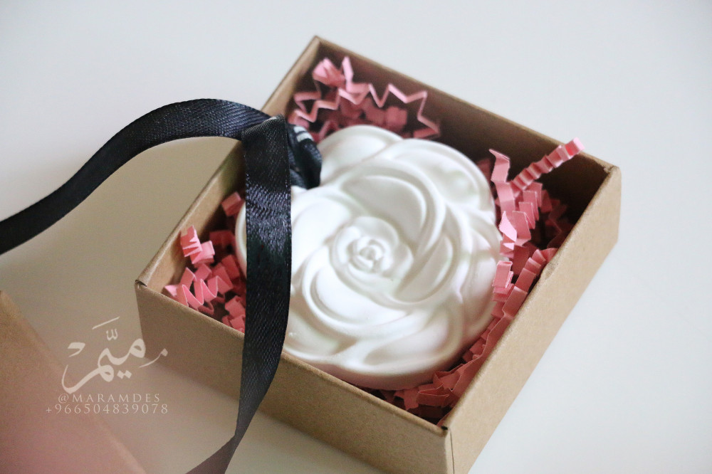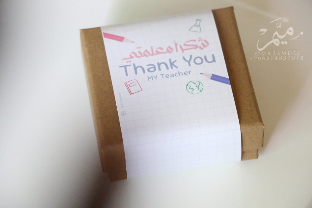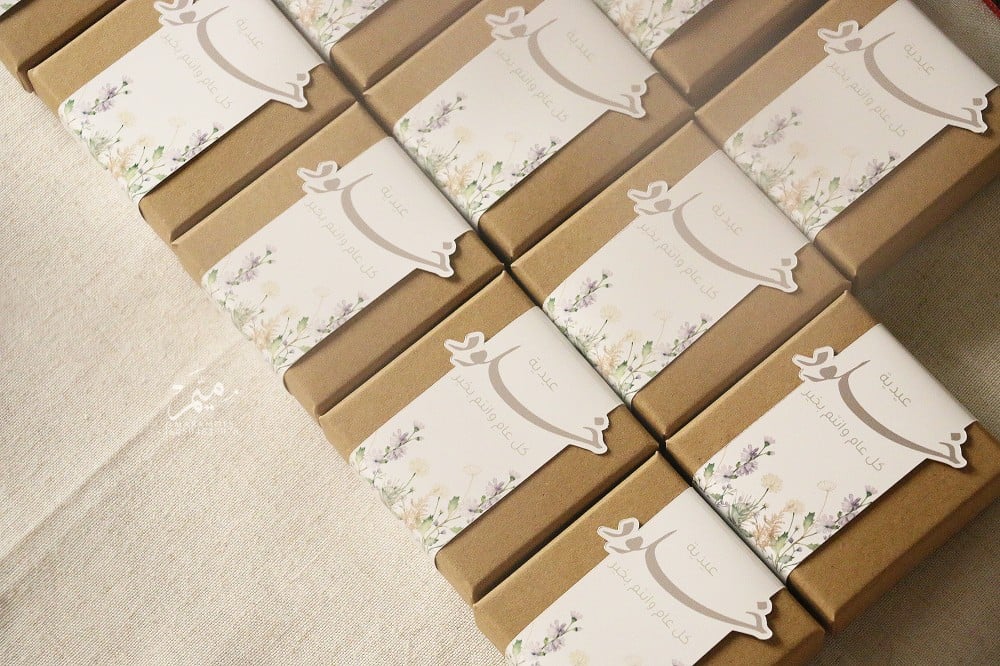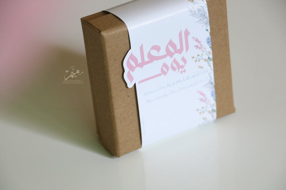 تلف على العلبه ورق مقوى بالامكان اضافة اسمكِ بشرط ان لا تقل الكميه عن 10 حبات